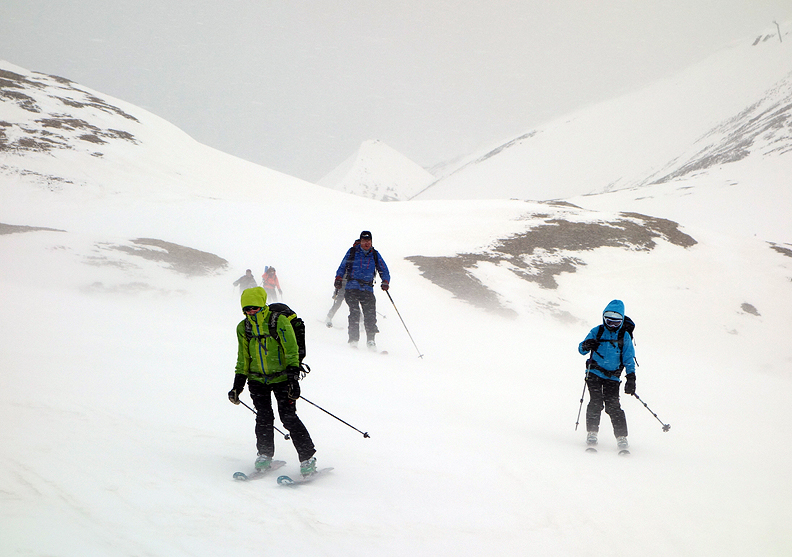 The following morning the clouds were still there, but the wind was down and a bit of snow had fallen, softening the worst of the frozen snow we had survived the afternoon previous. Leaving the hut, from left to right we are Mark, David, Marcus, Judith, Carla, Andy, and Terry. |