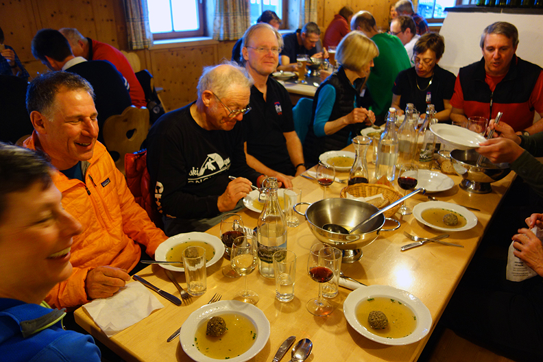 Enjoying the comfort of the Jamtal hut and some yummy "knodel soup". |