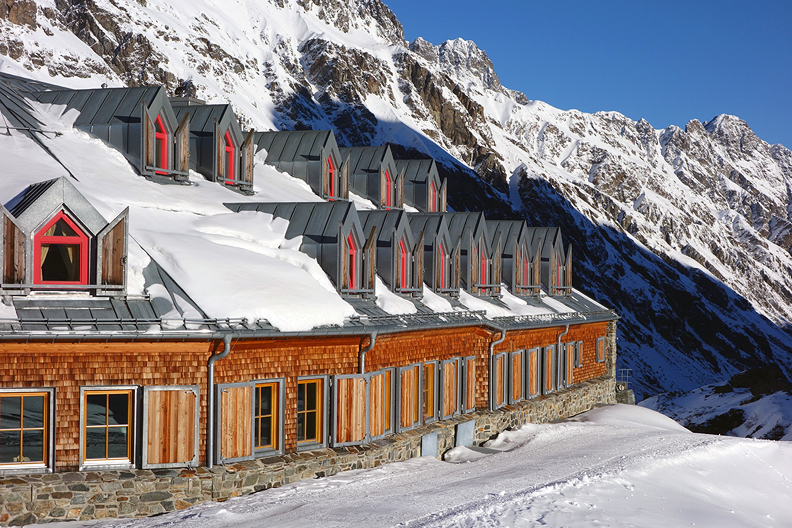 The massive Jamtal hut in the next morning's bright sunshine. |