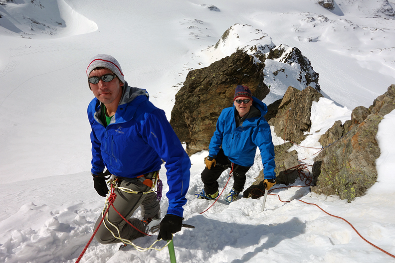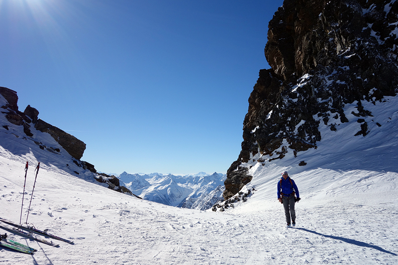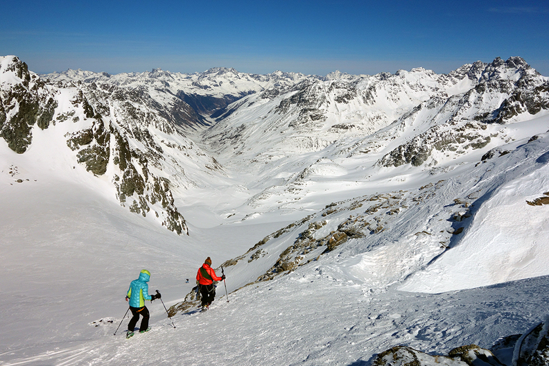 Reaching the high point above the Bielertal, we are ready to rip our skins for the last time. |