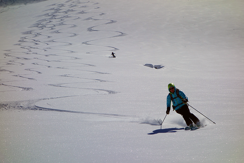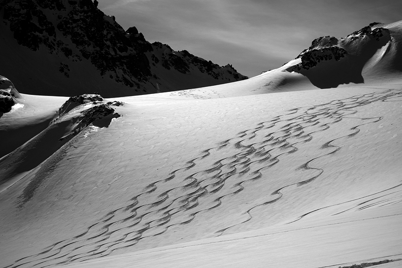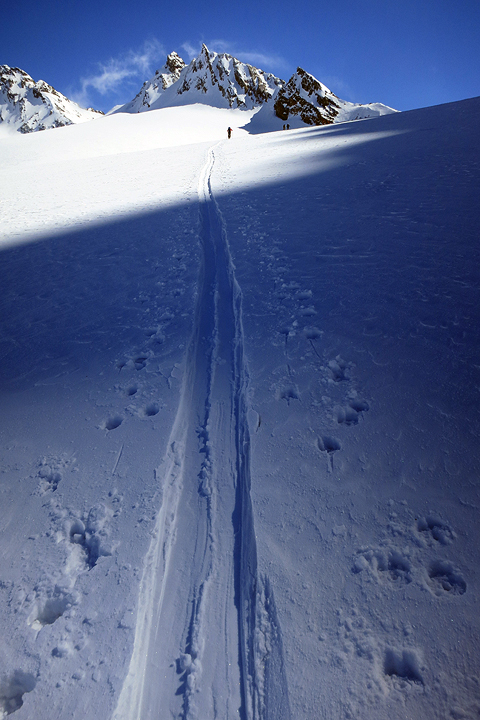 The following day we headed over to the Wiesbadener hut. On our way, we have one more chance to gloat over the tracks of our previous day's descent! |