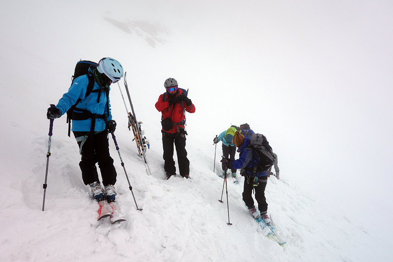 Very steep and firm slopes with little chance to assess the safety of what lay below, nor the duration of what lay above, convinced us to turn around before reaching the glacier basin below the peak. |