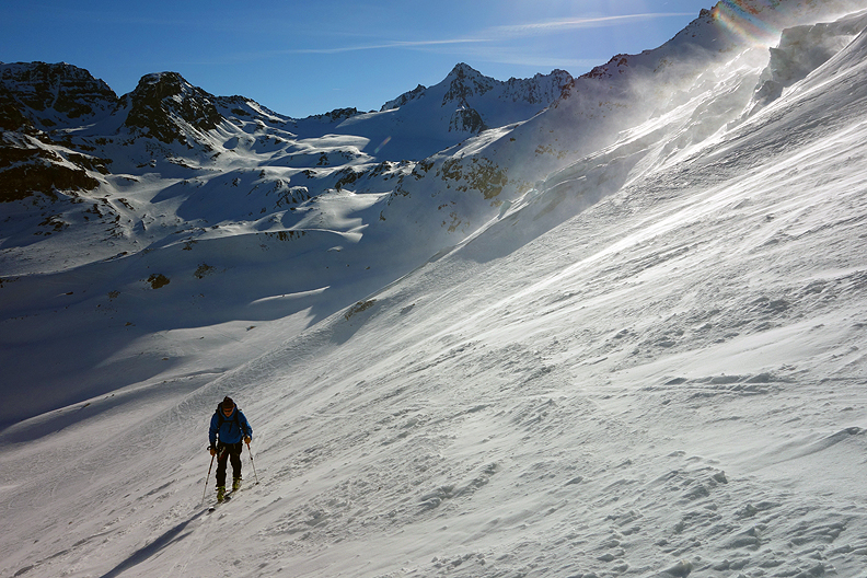 And then, just as we reached our high point at the Krone Joch pass, the wind picked up fierce and cold again, trying to push us back to where we came from. Ripping skins in the howling gale was the challenge of the day. |
