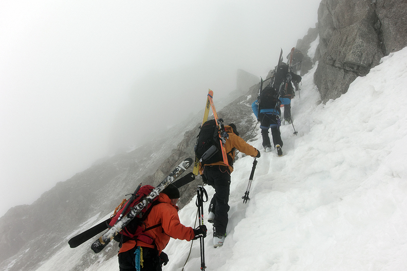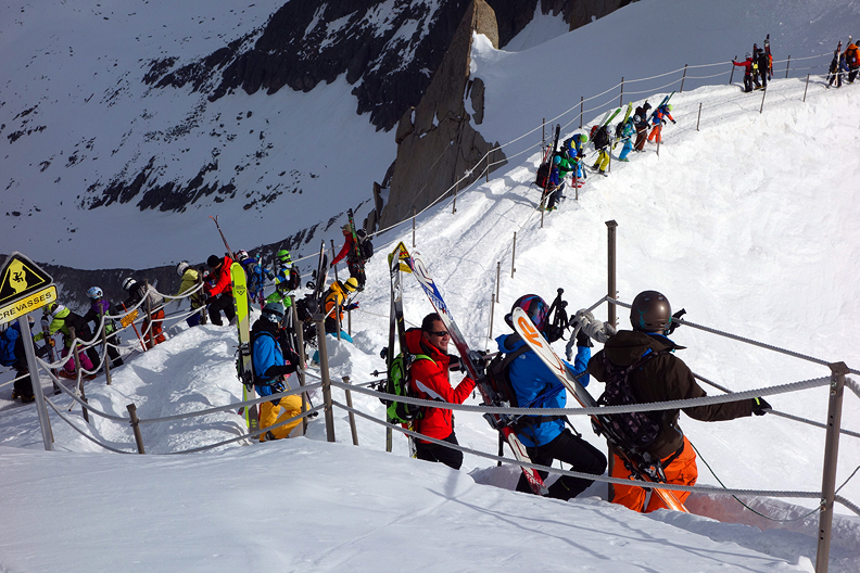 The typical hurly-burly of the Aiguille du Midi ridge descent, well equipped for the ski season with sturdy posts and hawsers. |