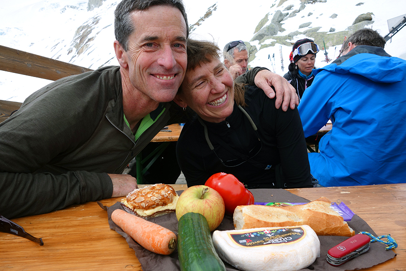 Lunch at the Requin hut; John and Sharon take a break from cheesy Savoie fare, to stock up on fresh veggies while they can. |