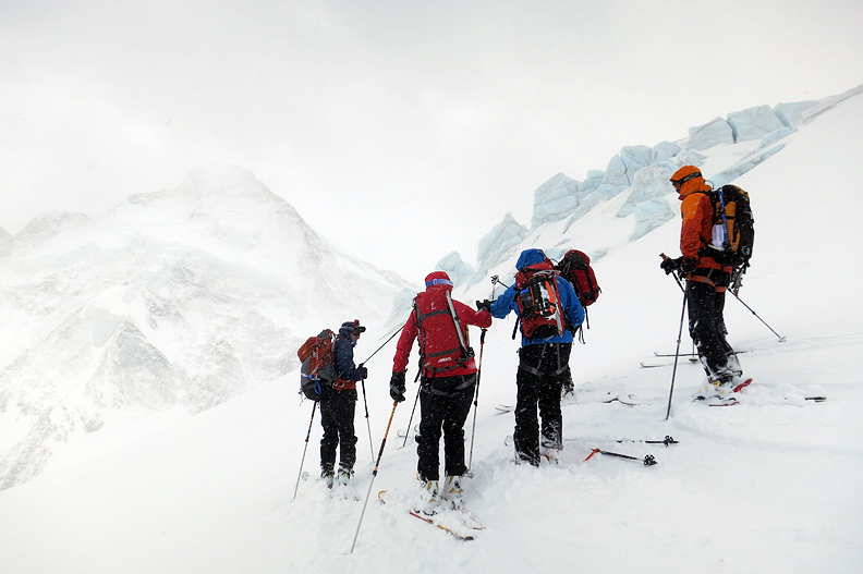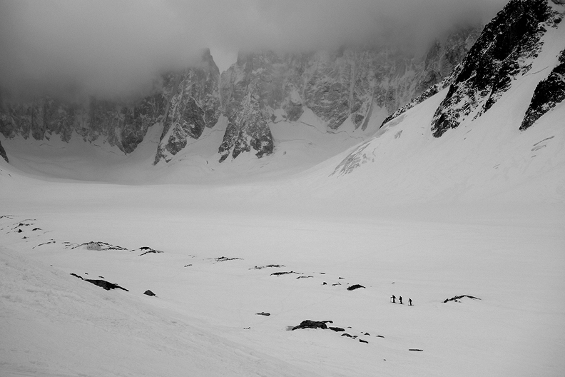 Another group of skiers braving the gale-force winds on the Argentière glacier. |