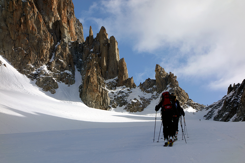 Looking back toward the Grands Montets ski area and the Aiguille Verte. Despite the lovely weather, we are nearly alone on this ascent! |