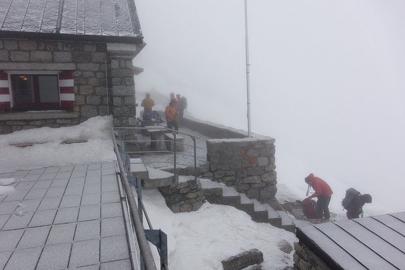 After our shake-down on the Vallée Blanche, our second day coincided with a cold, windy, very foggy day. Hiking the last few steps to the Argentière hut, we don't have far to go in any case. |