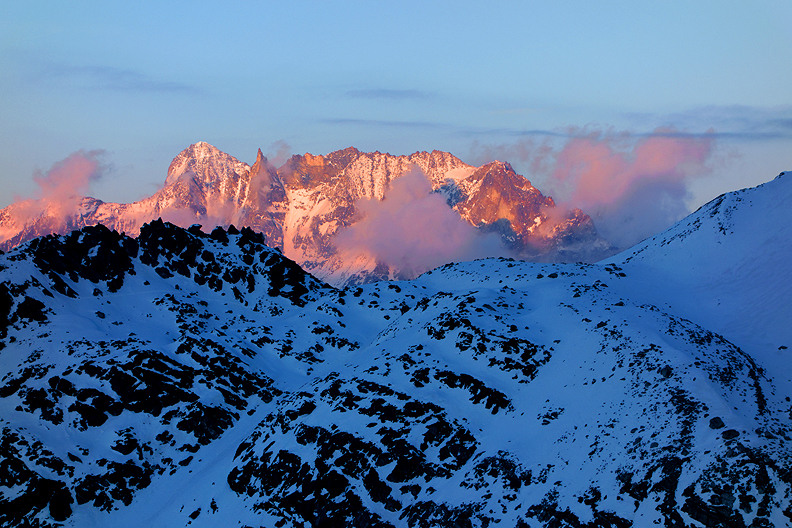 Lovely evening light on the Dent Blanche and the Aiguille de la Tsa, from the terrace of the hut. |