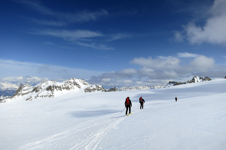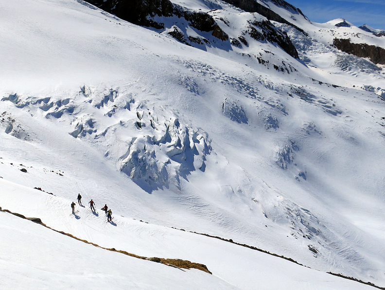 After a long traverse above the Lac des Dix, interrupted by the obligatory crossing of frozen avalanche debris, we take a detour to approach the Dix hut by the road less traveled. |