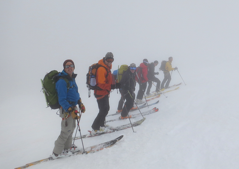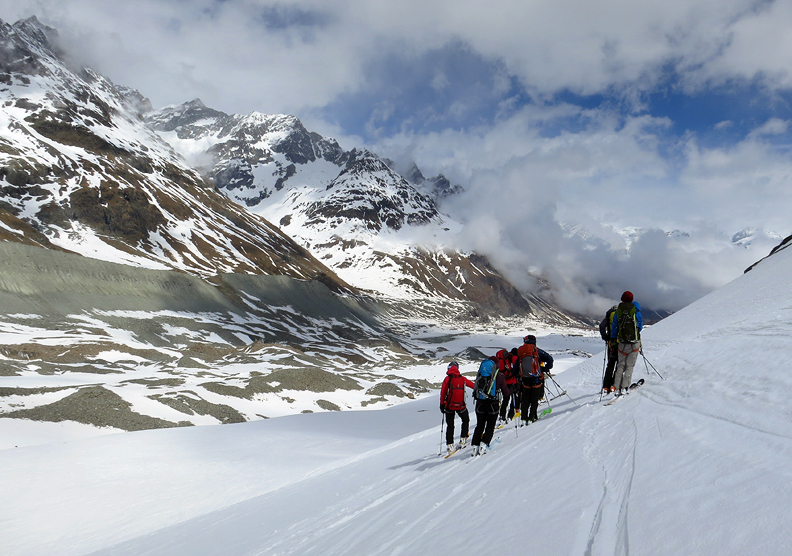 We make it through the last col, the Col de Valpelline, with just a bit of wind and quite poor visibility, but things improve quickly as we descend. |