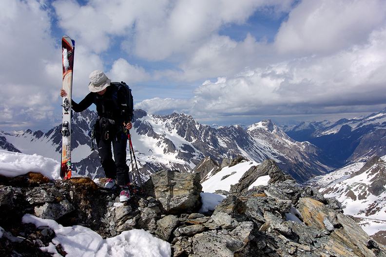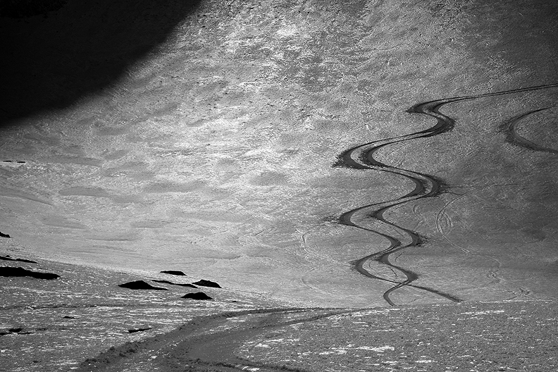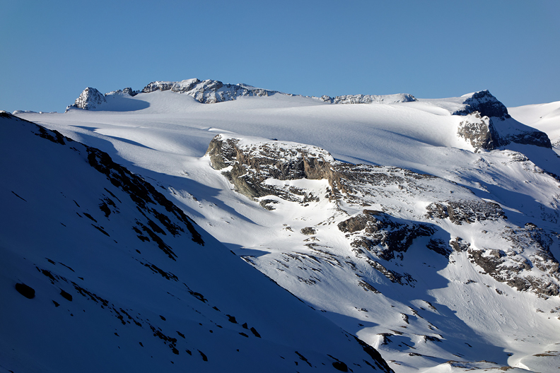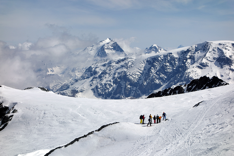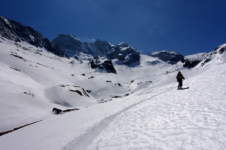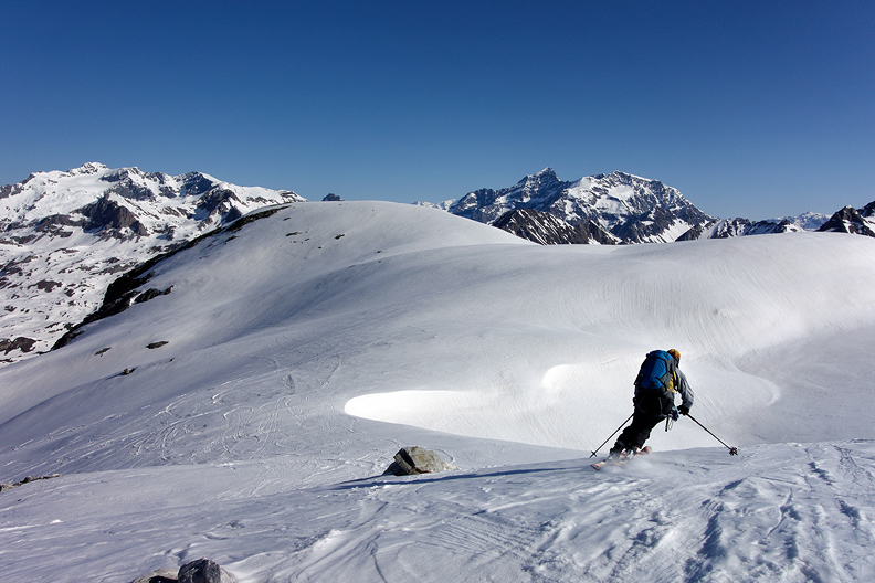 We are rewarded with a long and varied descent of the Glacier de Gébroulaz. Many possible lines down this drainage! We left the crowds behind as everyone seemed to be on a different program once past the Col. So many choices! |