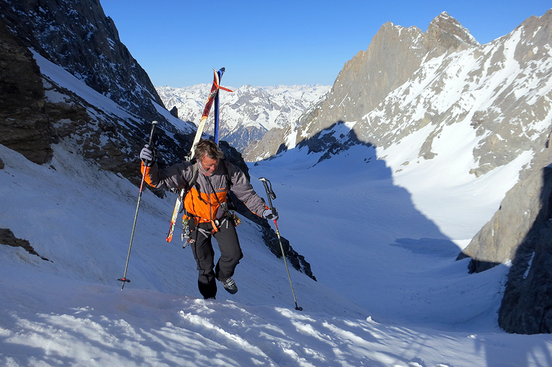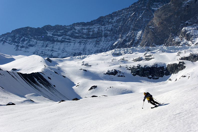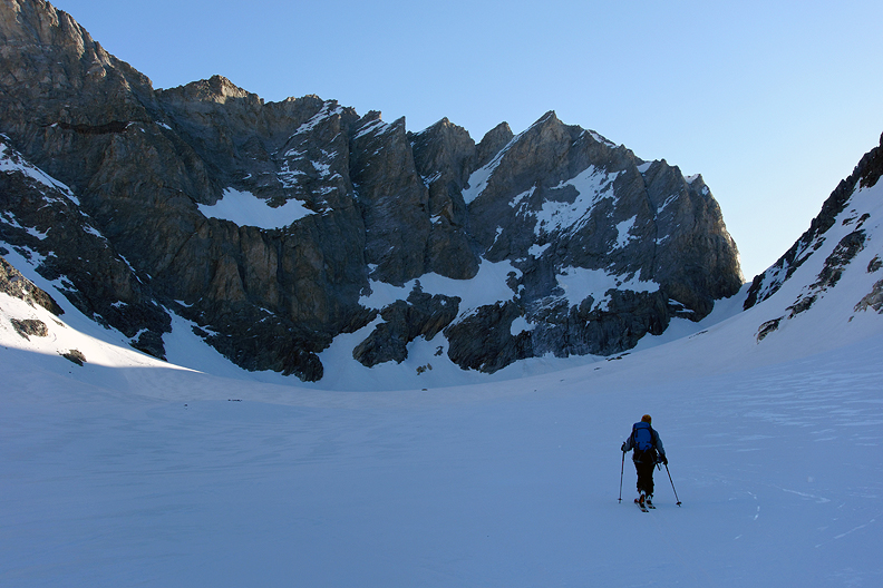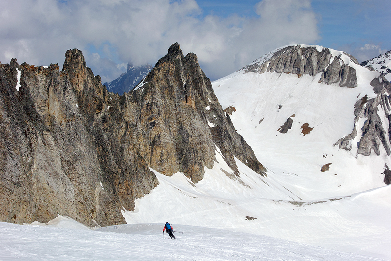 Corn snow beneath the dramatic wall of the North Face of the Grande Casse. |