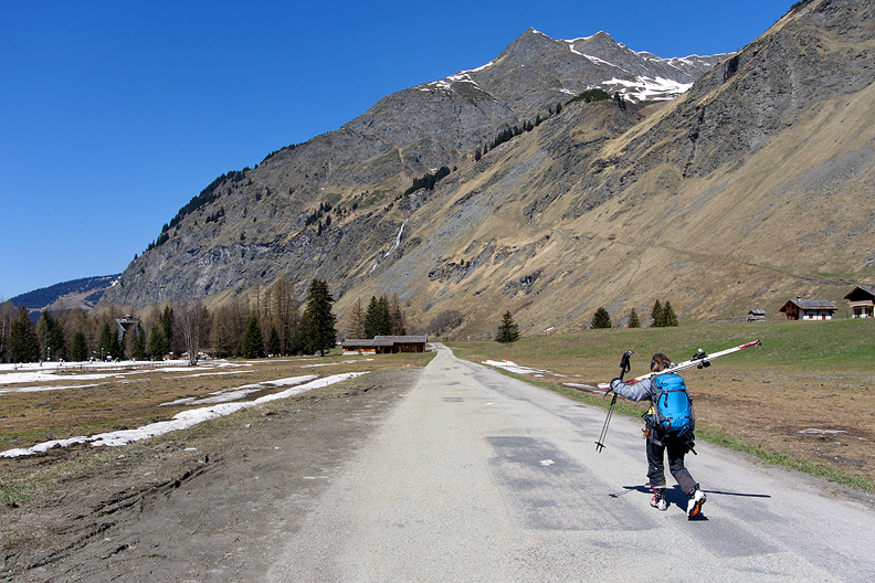 At last we reach the road end at Champagny-le-haut. No more snow to ski here! |