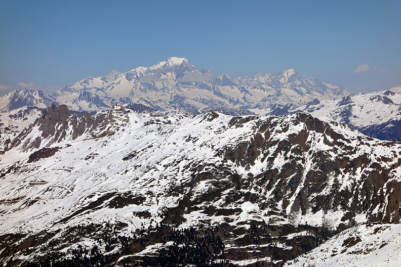 A taxi ride takes us back to the Trois Vallées ski resort, which we re-enter at Brides-les-Bains. A long cable car ride takes us back to the heights, and we get a magnificent view of the distant Mont Blanc. Quite nearby as the crow flies! |