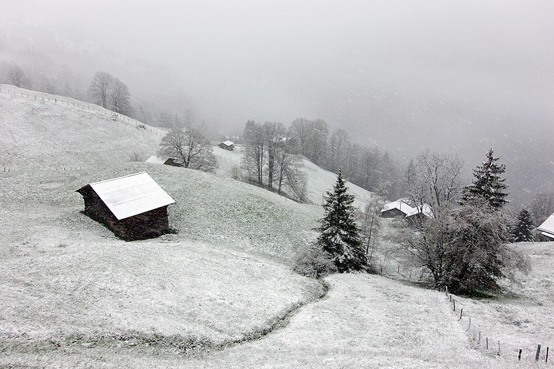 The snow accumulating on the grassy fields below Wengen, from the train window. |