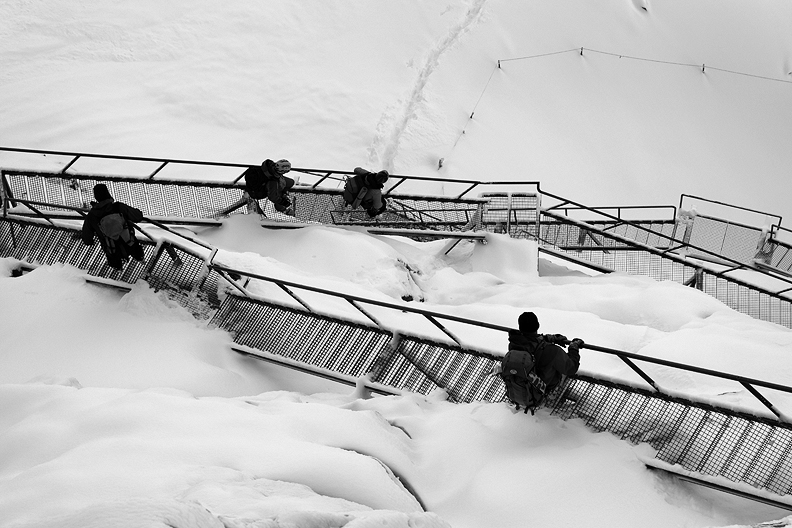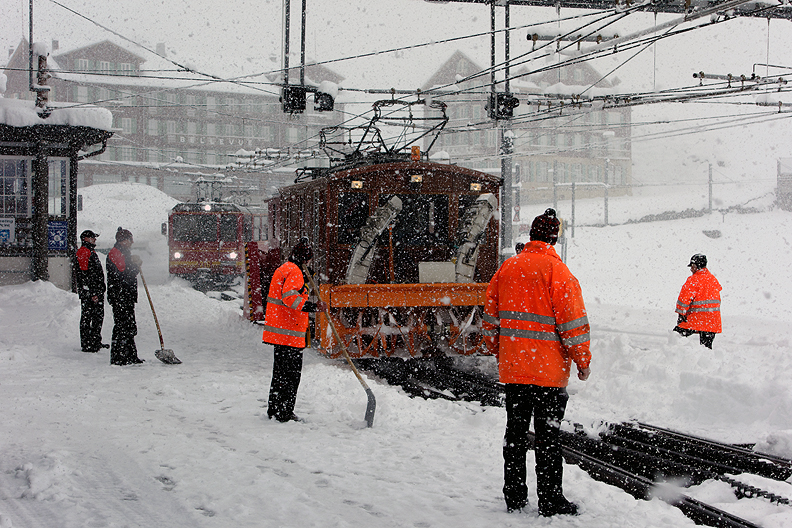 A slight delay at Kleine Scheidegg, as the railroad workers cleared the 50+cm of new snow from the tracks. |