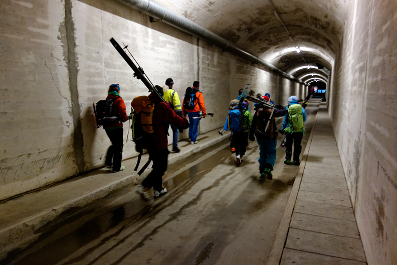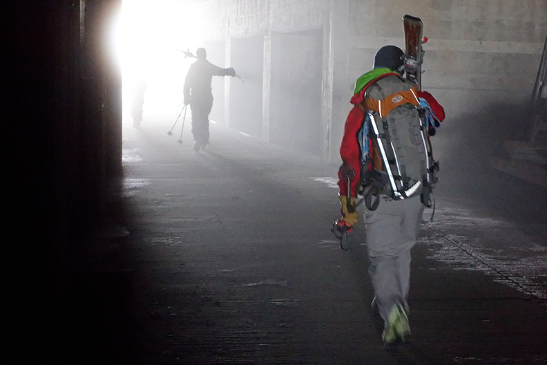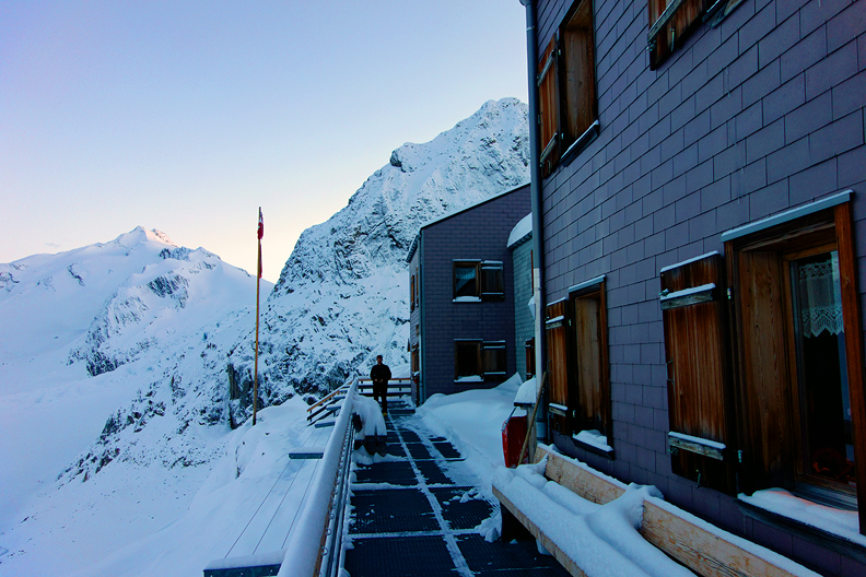 The last steps in to the hut are via an avalanche-shedding tunnel. |