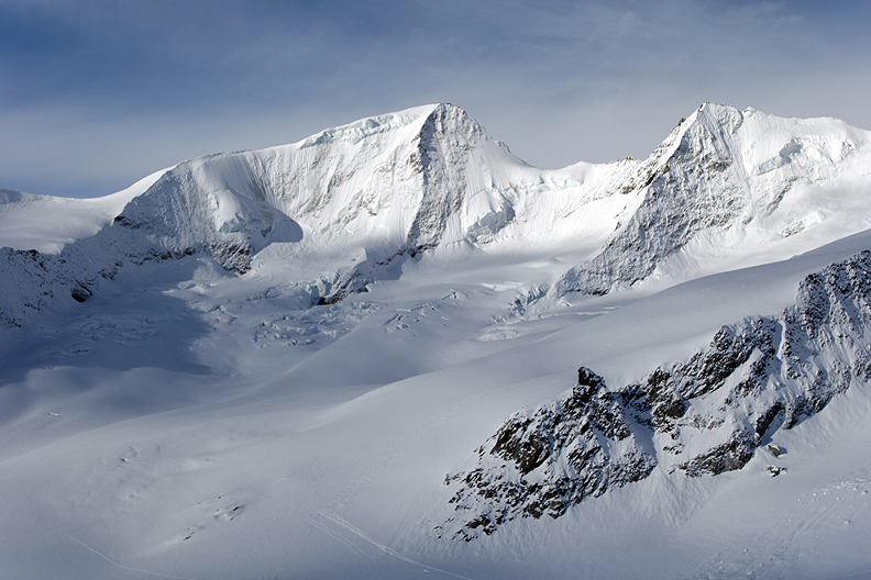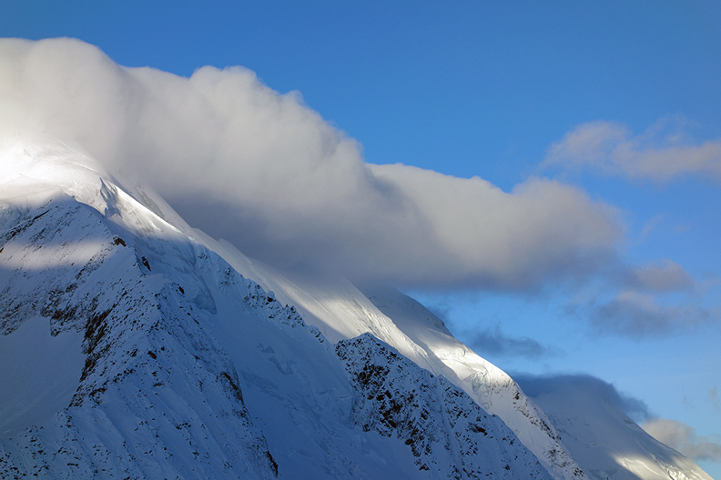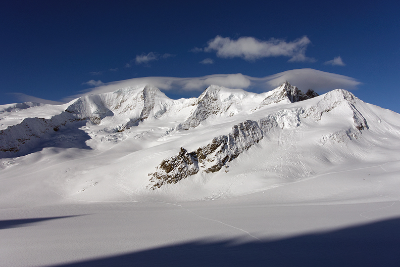 Morning sun and cloud shadow on the Aletschhorn. |