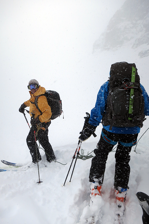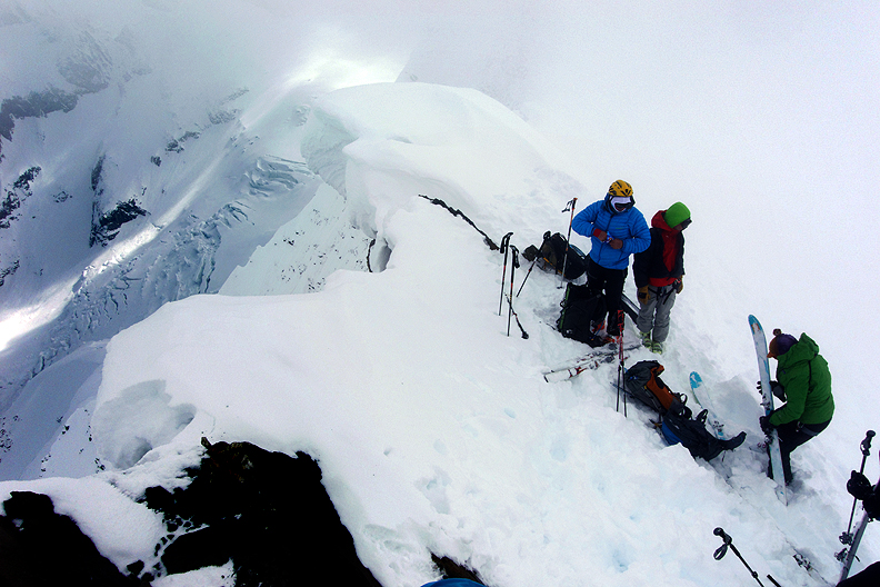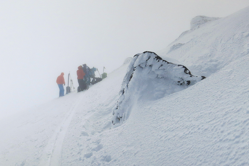 A pointy summit, above an incredibly steep wall! Avoiding the cornices, we transition to head down again. The mists thickened and made the difficult snow even harder to ski, but we powered through! |