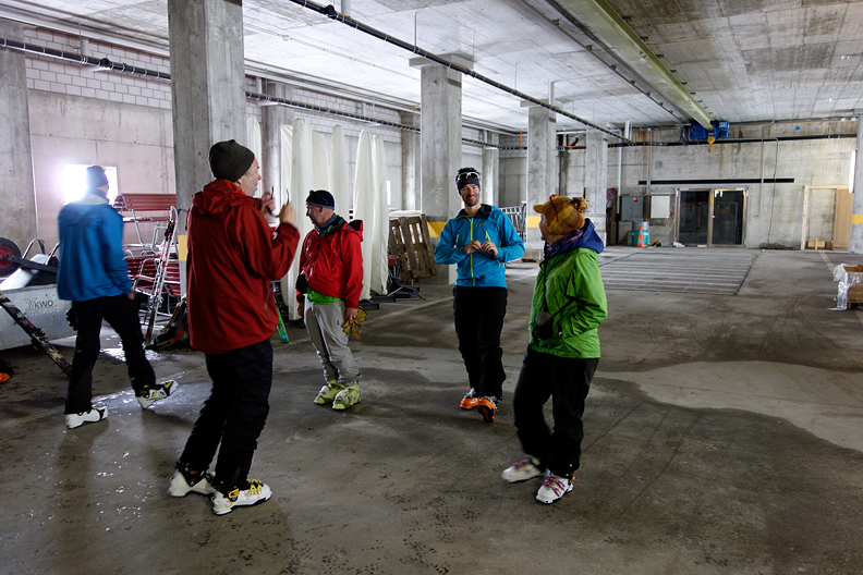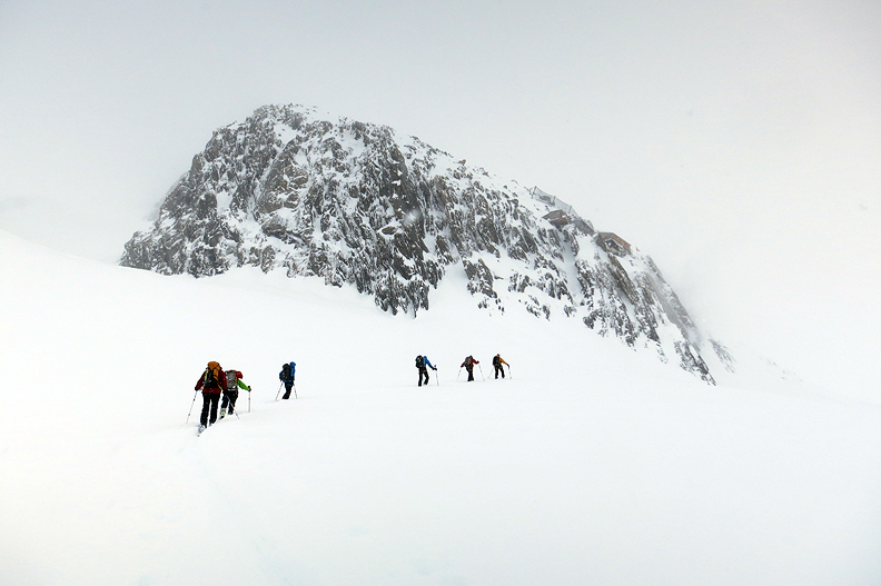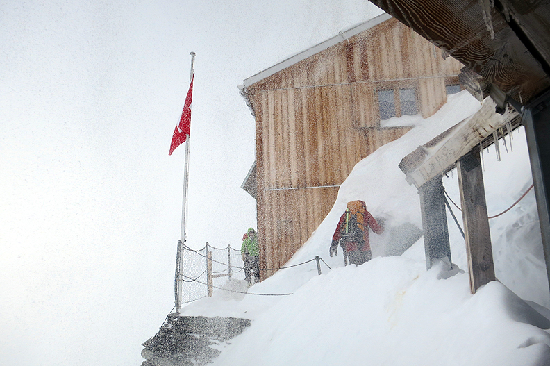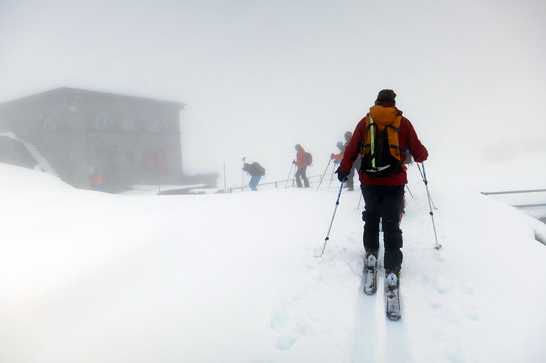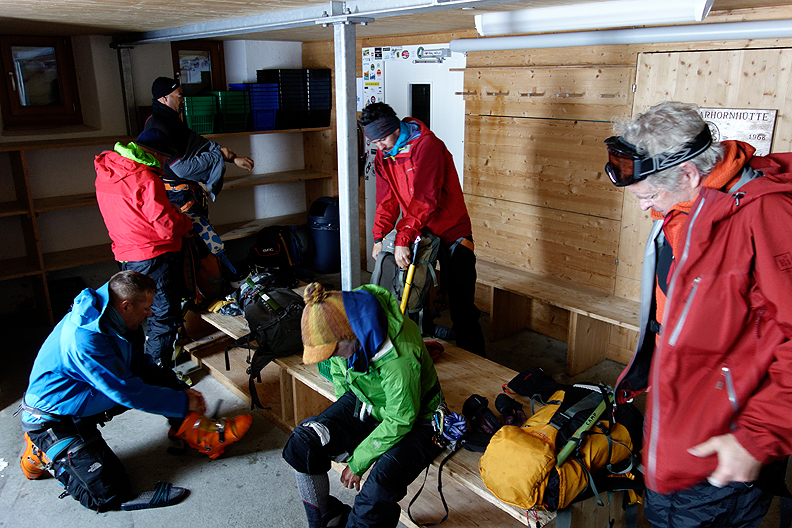 On our second-to-last day, we prepare to move over to the Oberaarjoch hut. We are suiting up for snowy weather once more. |