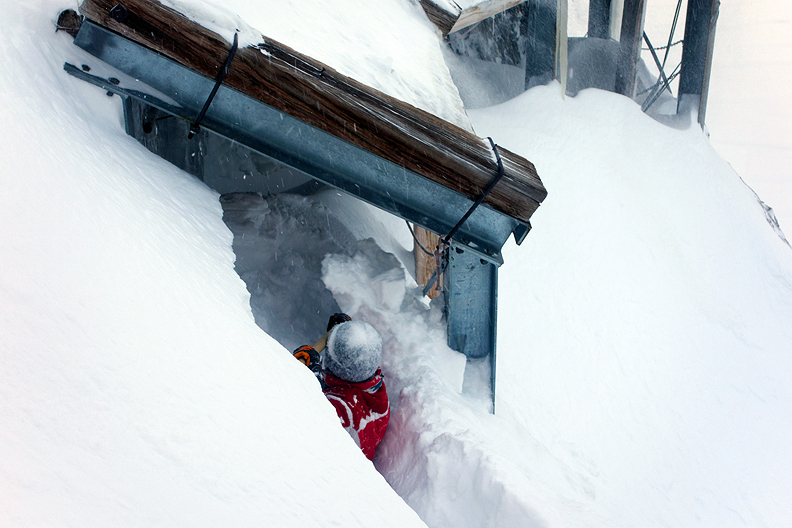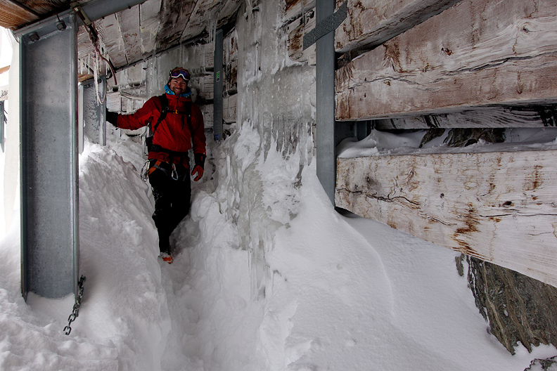 The next morning, the hut keeper Gaia obligingly dug us a trench in the newly fallen and filled-in snow to the avalanche shed. |