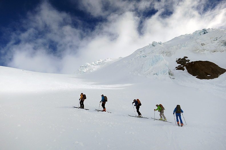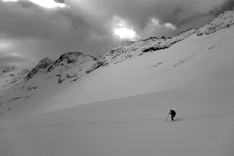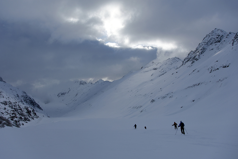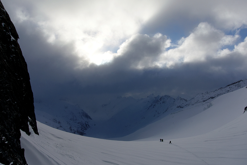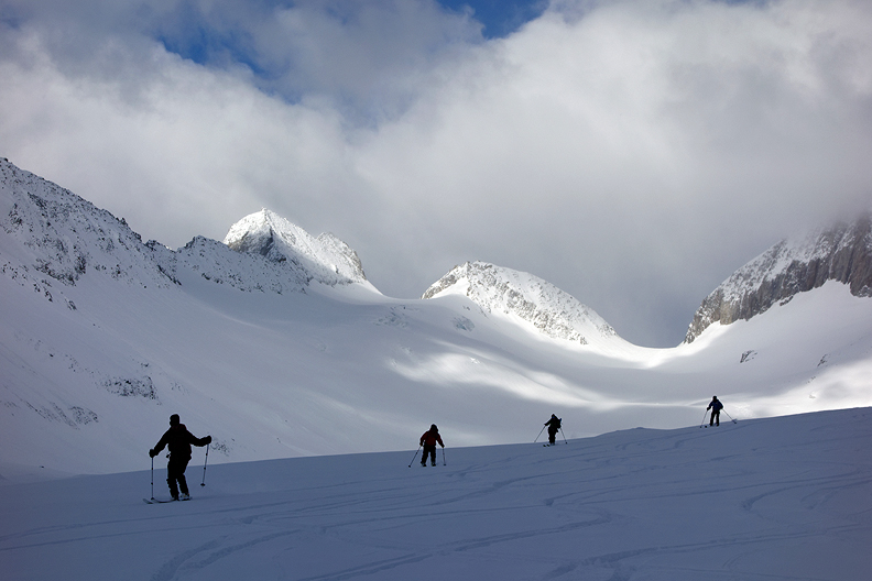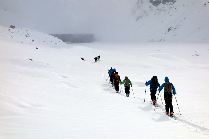 As is often the case, our last ski tour of the season was in the Bernese Oberland. The region had quite a dry winter up through the end of March, so we expected firm and bony conditions in places. Instead, a big storm with a massive snowfall ushered in a week of squally Spring weather, with several dumps interspersed with sunny periods, keeping the snow challenging and us on our toes.