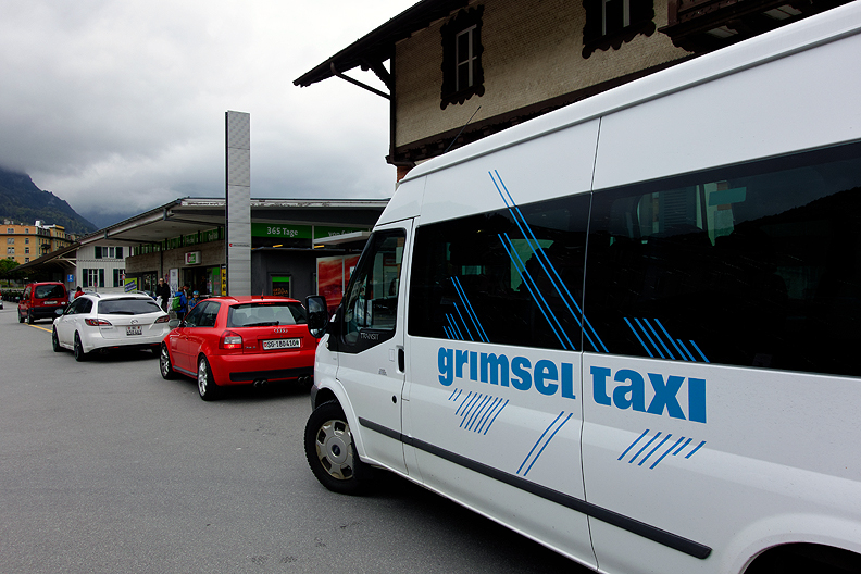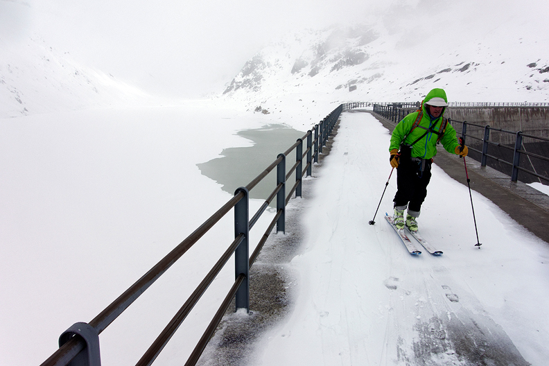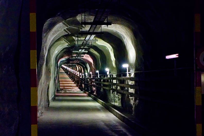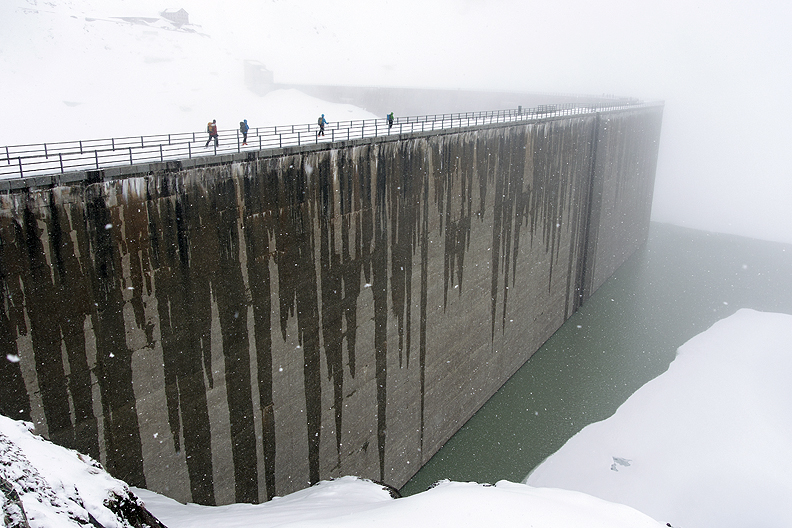 From the closed Hospiz at the Grimselsee, we followed our new friend Rolf, an Interlaken guide, who believed he could usher us along a detour he knew of, in the hopes of avoiding some steep slopes above the road. This turned out to be the most interesting part of the day, blindly going with the flow through the bowels of a Swiss hydro tunnel complex. |
