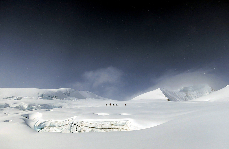 The depth of new snow and the slowness of our roped travel, meant we skipped our usual first night at the Hollandia hut, and instead went straight to the Konkordia hut. The next morning was beautiful! |