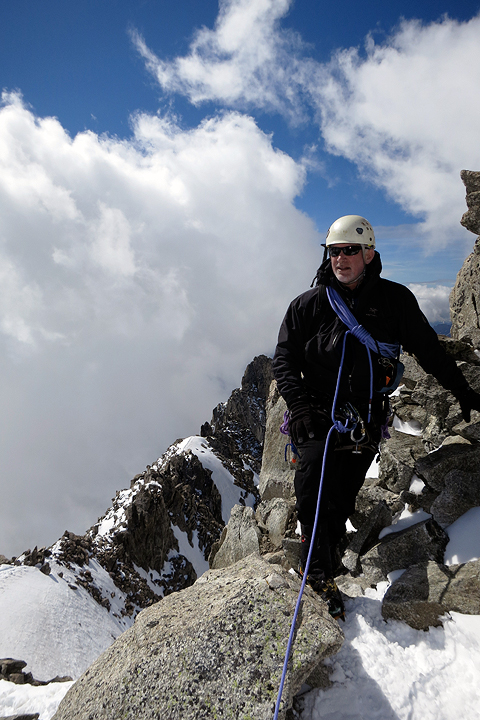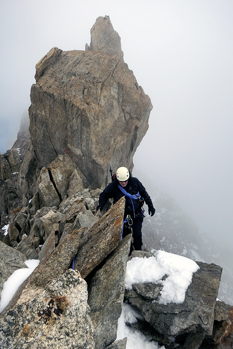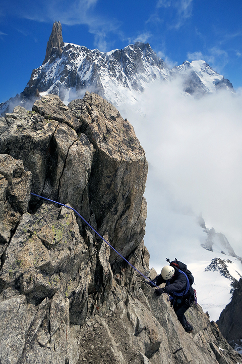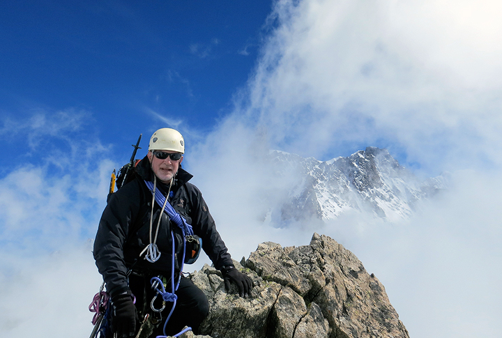 The Dent du Géant and the Grands Jorasses in the background, Ken pulls the final moves on the summit block. |