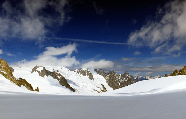 The climb requires a fairly short walk from the Point Helbronner lift top station, across the expansive upper Géant glacier with its magnificent views. |