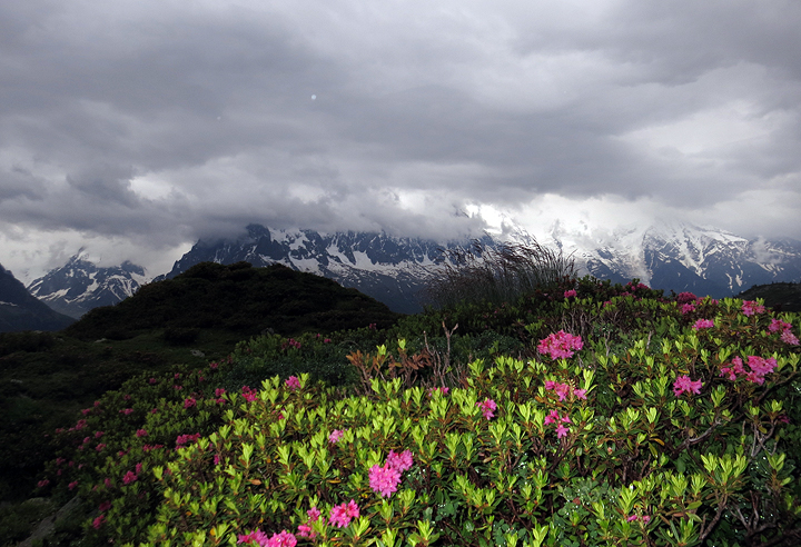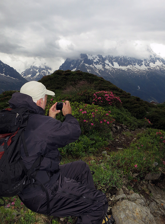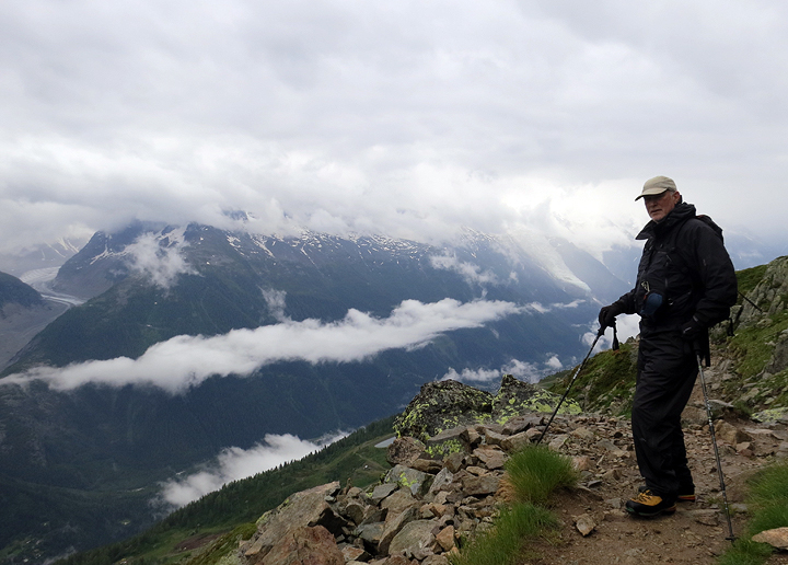 Our next day was truly sodden. We stalled a bit to see if things would improve, but they did not, so we settled for a hike up to Lac Blanc. Ken enjoys a brief lull in the clouds and general soupiness. |