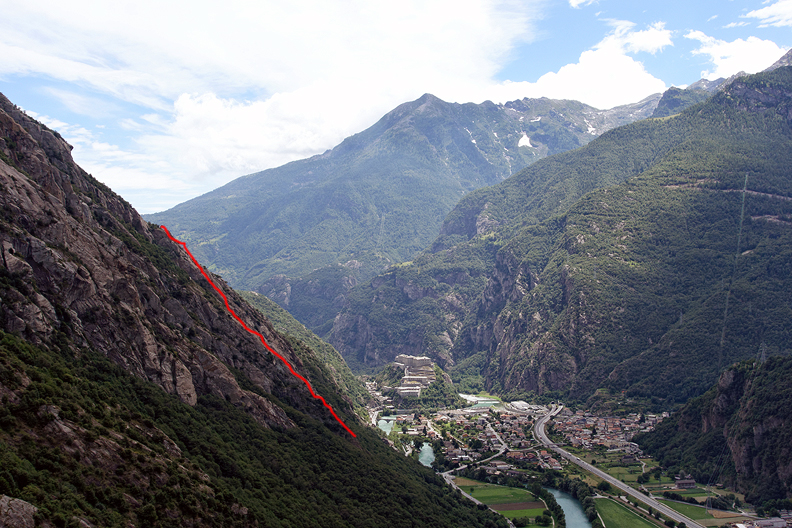 The red line shows the approximate location of the route, above the Forte di Bard. |