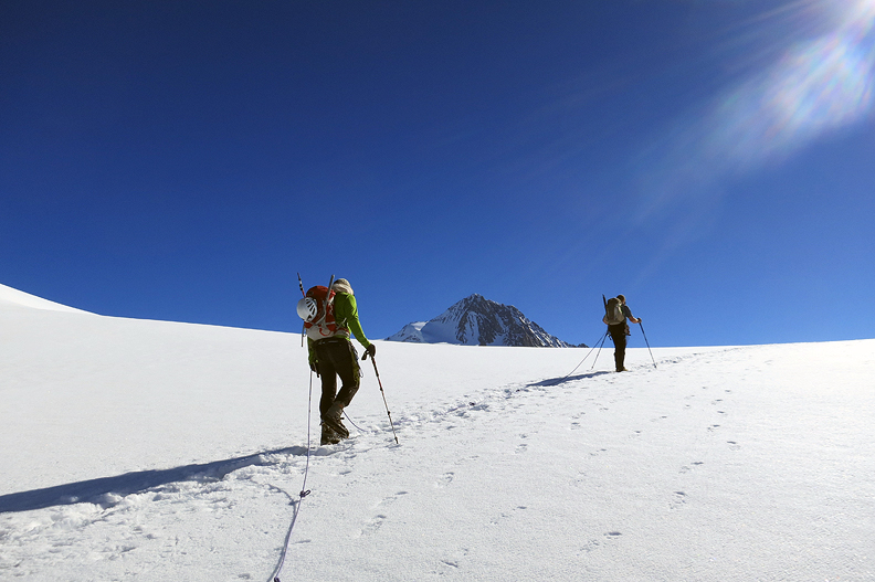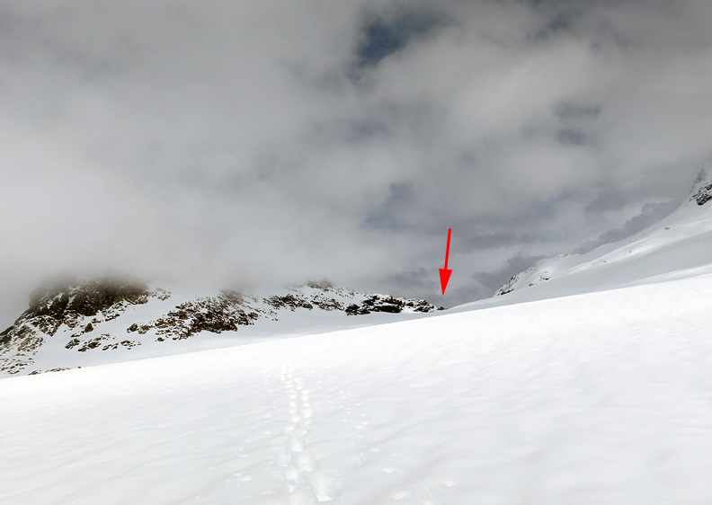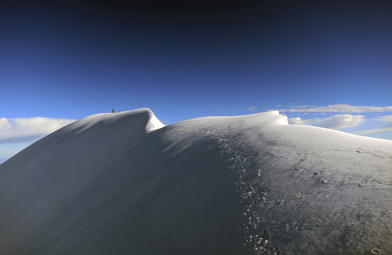 After a bit of delicate scrambling up often-loose rock and talus, the snow of the summit slope is still (just) firm enough to hold our body weight. |