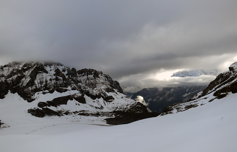 The next morning, the visibility began to clear by the time we were ready to head down. Our goal, to descend the Tschingelfirn glacier into the Lauterbrunnen valley, and to join up with Laura and John in Wengen. A hole in the clouds revealed part of the Jungfrau as we started out. |