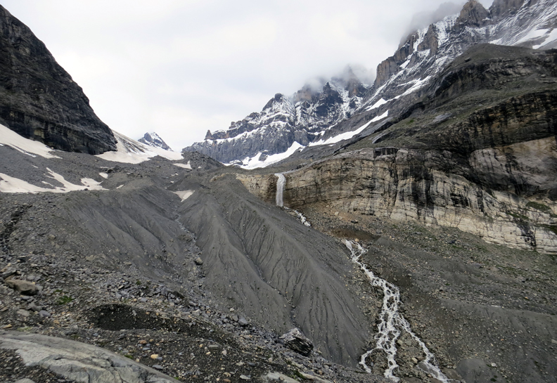 We did get rained on a bit as we approached the edge of the glacier. Looking at (what we can see of) the backside of the Blumlisalp ridge. |
