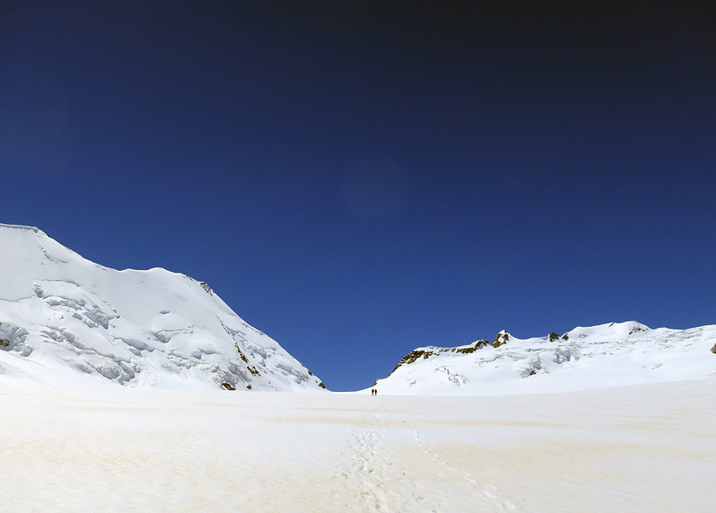 The Konkordia Platz and Aletsch Glacier stretch away below us into what looks like infinity. We will turn right at the junction, and head west to the Lotschenlucke and the Hollandia hut. |