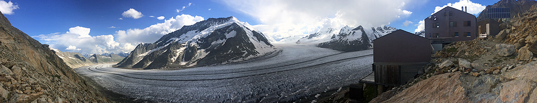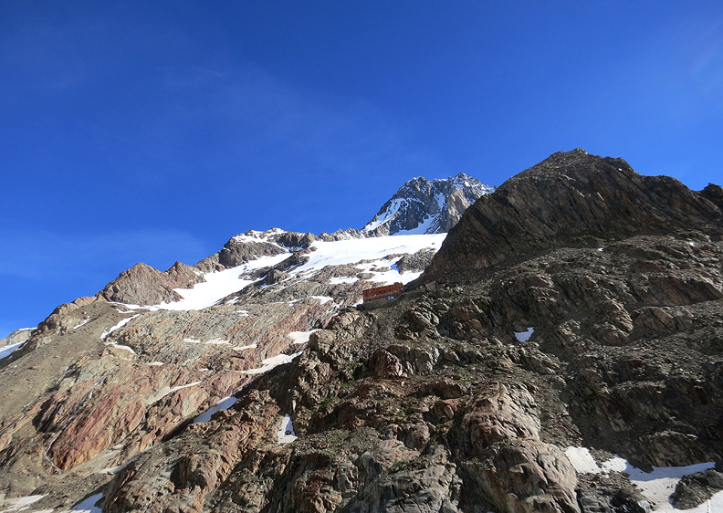 The hut, tucked up under the Finsteraarhorn, keeps getting further from the glacier as it recedes. |