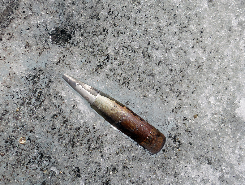 The Fiescher glacier is an area where the Swiss military do a lot of shooting practice in the late Fall season. The ice is littered with these little hummers (about 7 and 1/2 inches long). |