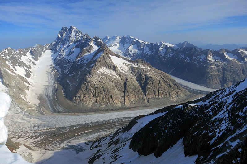 The views northward into the remote upper reaches of the Finsteraargletscher are intriguing. |