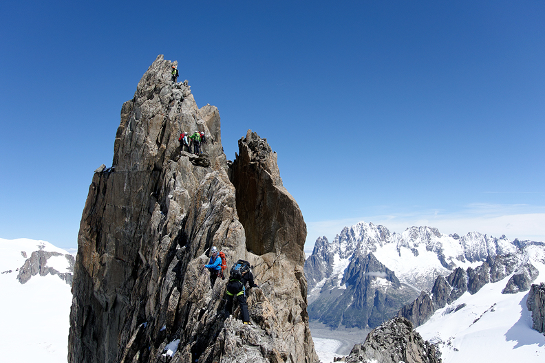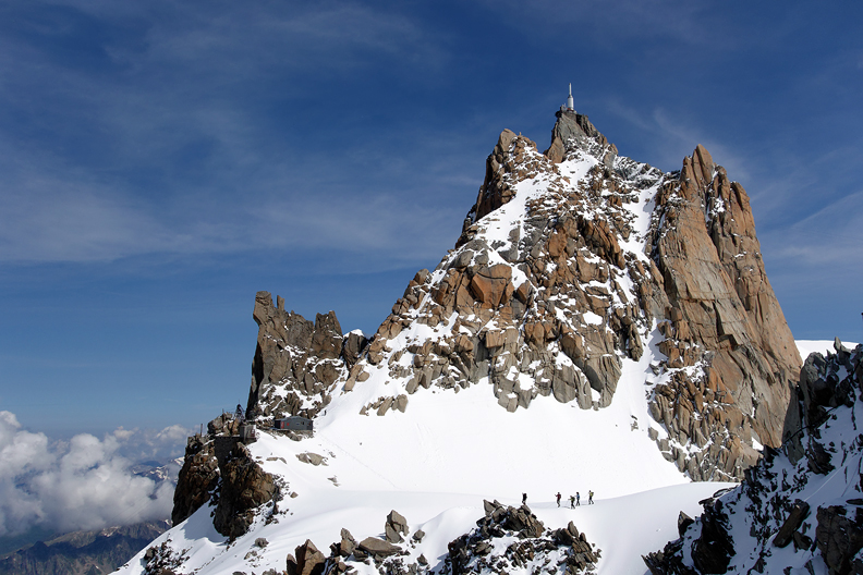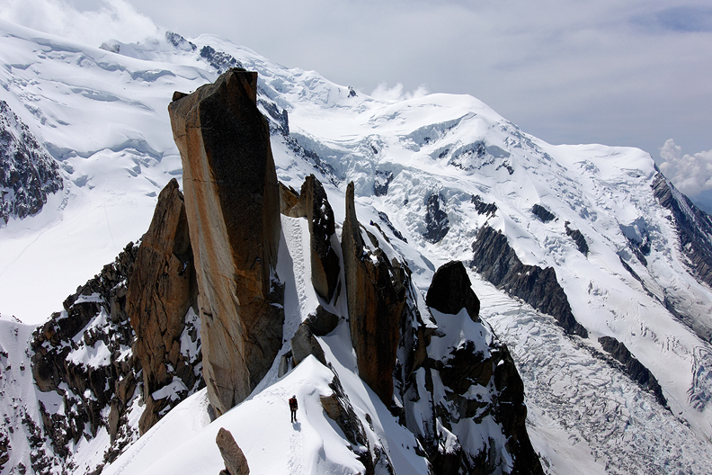 We had a day of fine weather to start, but only one day. We chose the classic Arete des Cosmiques to begin. This shot was taken from the bridge on the Aiguille du Midi. |