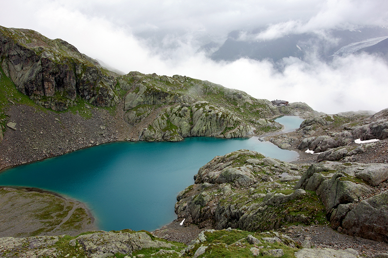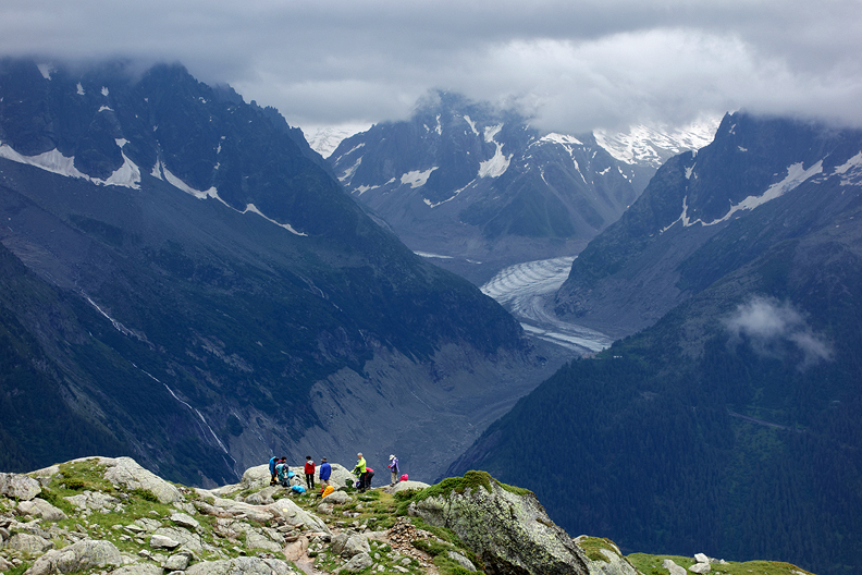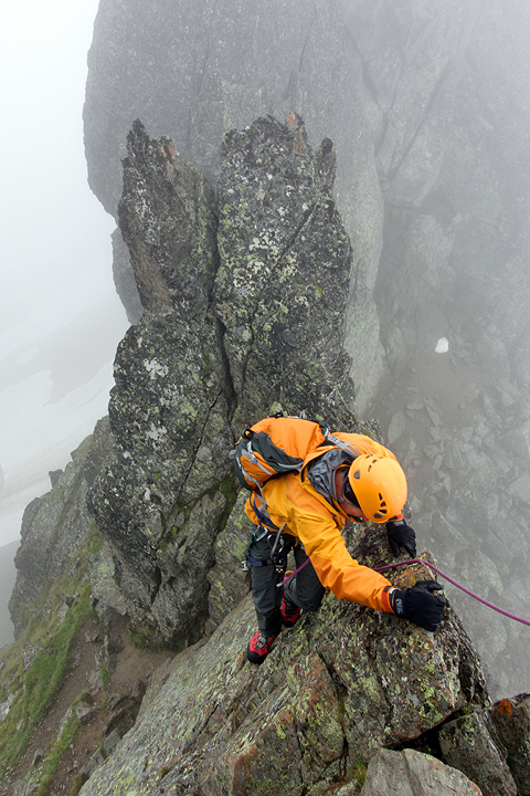 Our Day 2 was not so sunny. Rain in the morning tapering to showers was the forecast. We had a good time on the Aiguille de Crochues–wet rock, slippery lichen and all. |