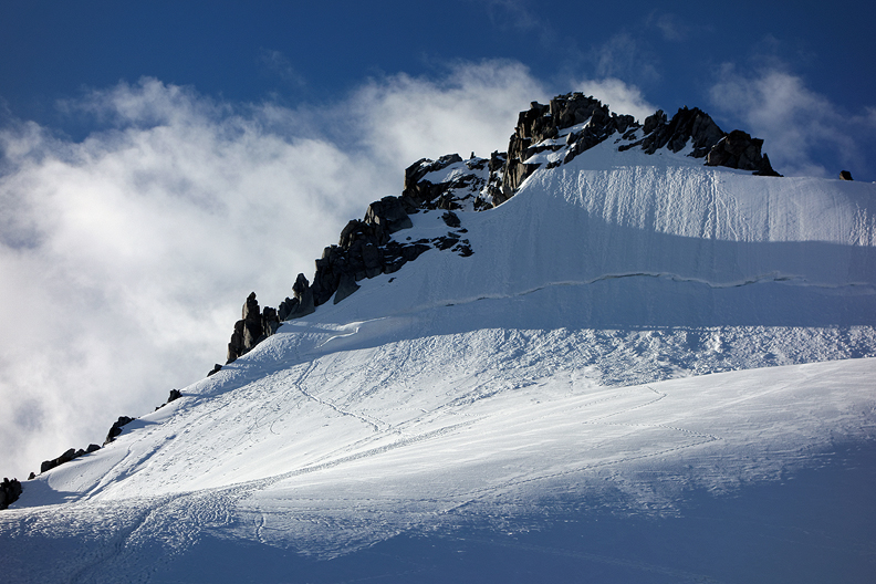 Nice conditions on the Entreves. A bit of new snow on the rock in the easier lower sections. But when the going got steep, things dried out. |