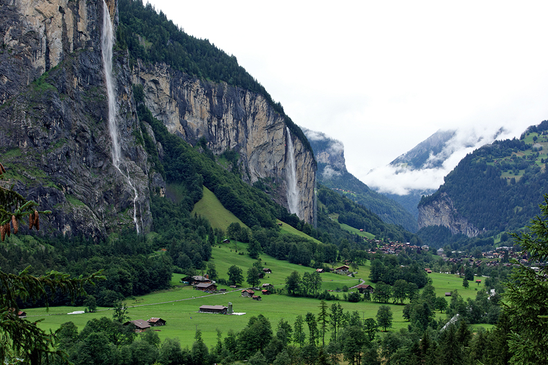We had one more day, but the weather was anything but agreeable. Since Bob wanted to end his trip in Kleine Scheidegg, we spent the day making our way to Lauterbrunnen in Switzerland's Berner Oberland. Here, in the Lauterbrunnen valley, the waterfalls were out in all their glory. |