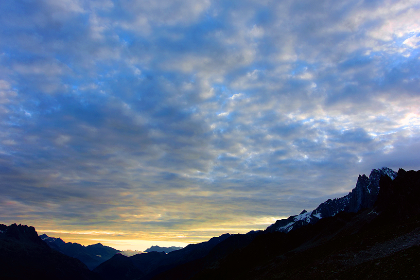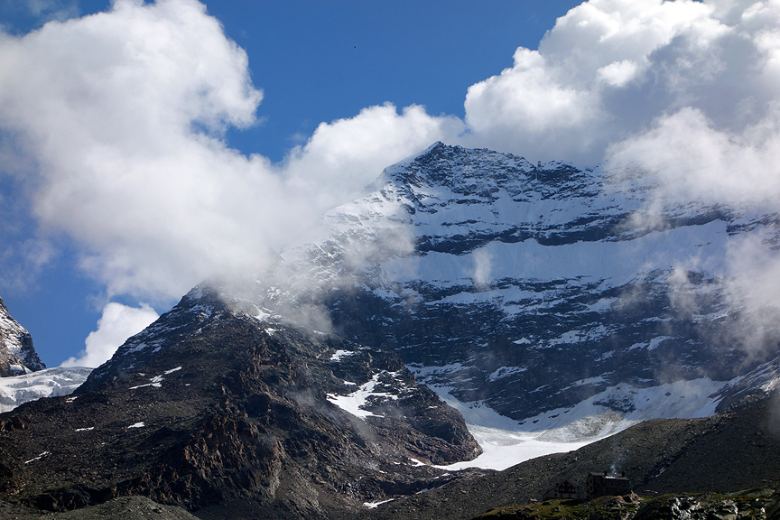 The first couple days of our time together offered only a bit of sun. We decided to head to the Weissmies hut, and give the Lagginhorn a go. A bit of new snow and less than ideal weather would be, we reasoned, manageable on this climb. |