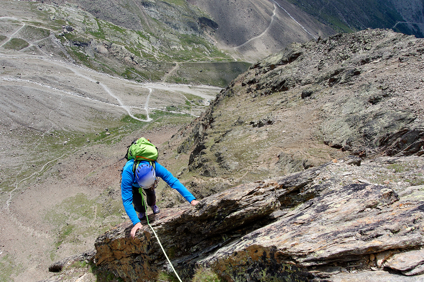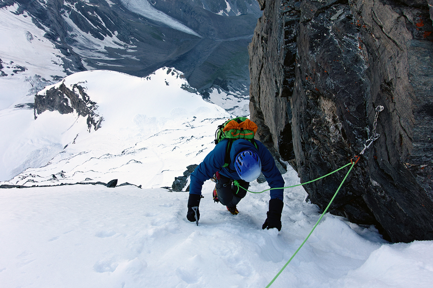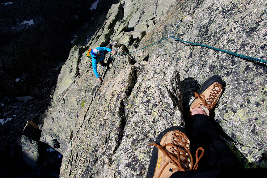 Good climbing (with a nice anchor!) as we round the last step on the ridge. |