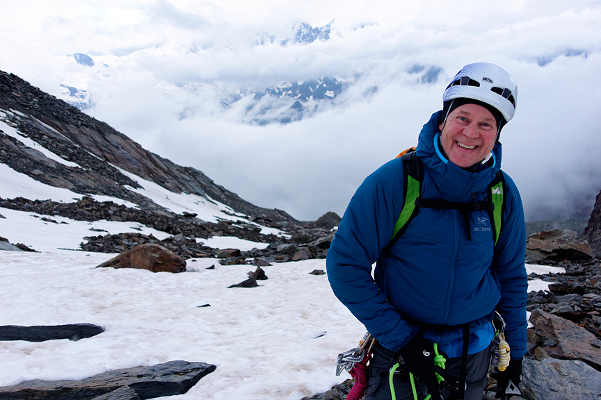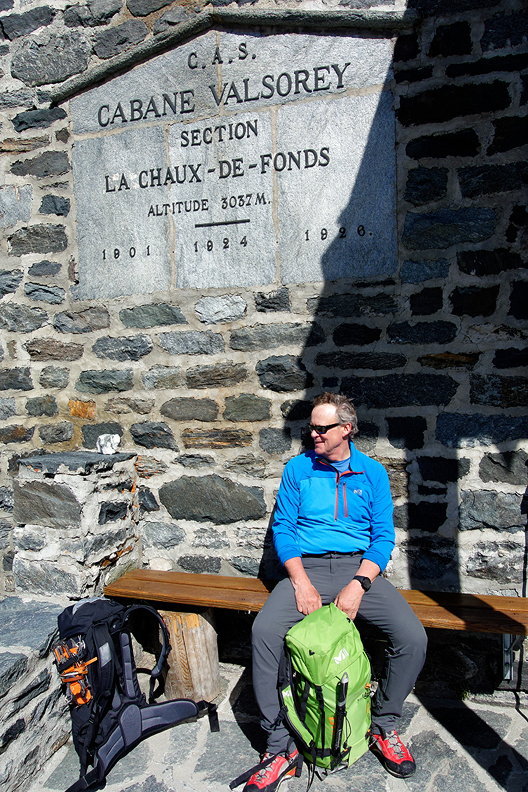 Grant on Alpendurst. The Weissmies hut, and our home for the night, is in the upper left corner of the photo. |