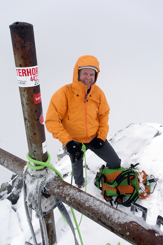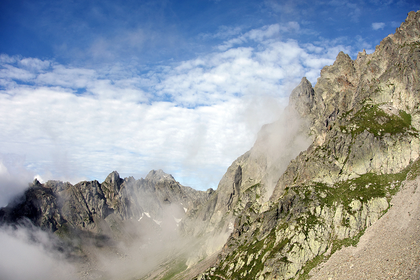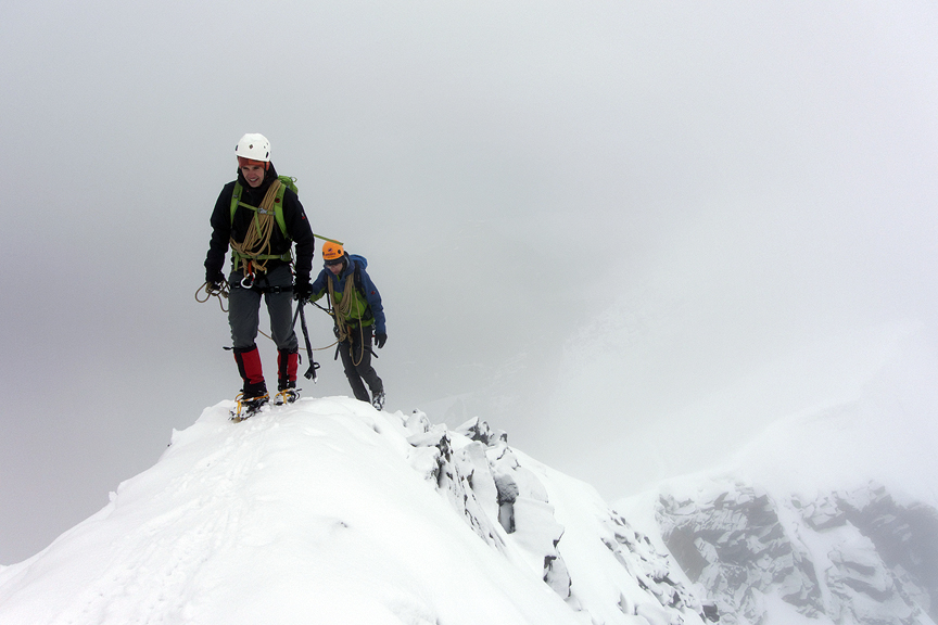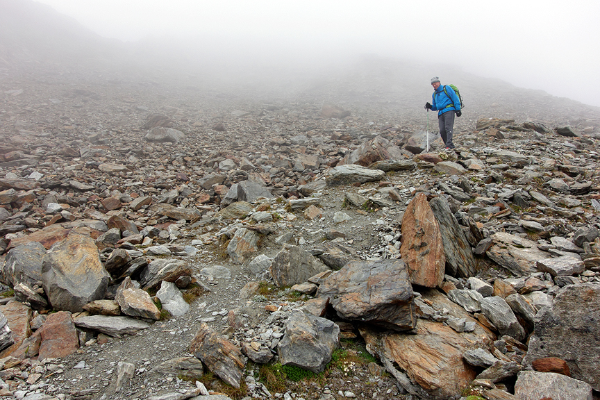 On the descent, walking back down into the mists. Our third day was truly nasty, and we did not manage to climb anything at all. |
