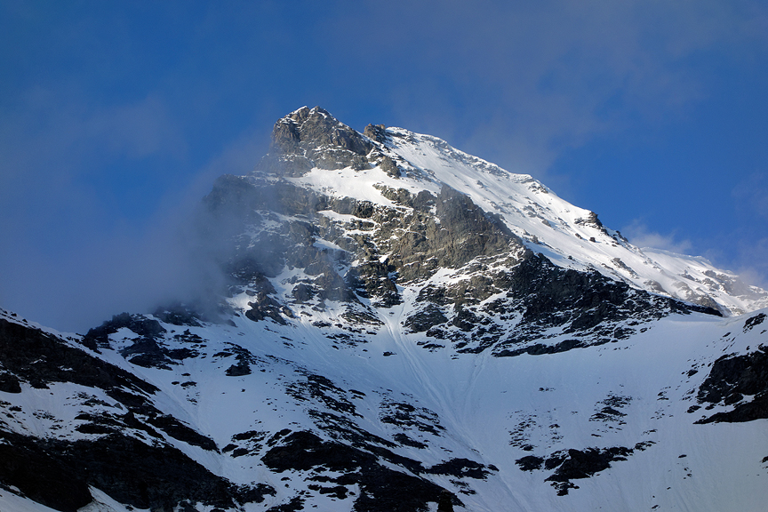 A view of our main objective, the Lagginhorn. With this much snow, the normal route is the only practical line. Mouse over the image to see the route. |