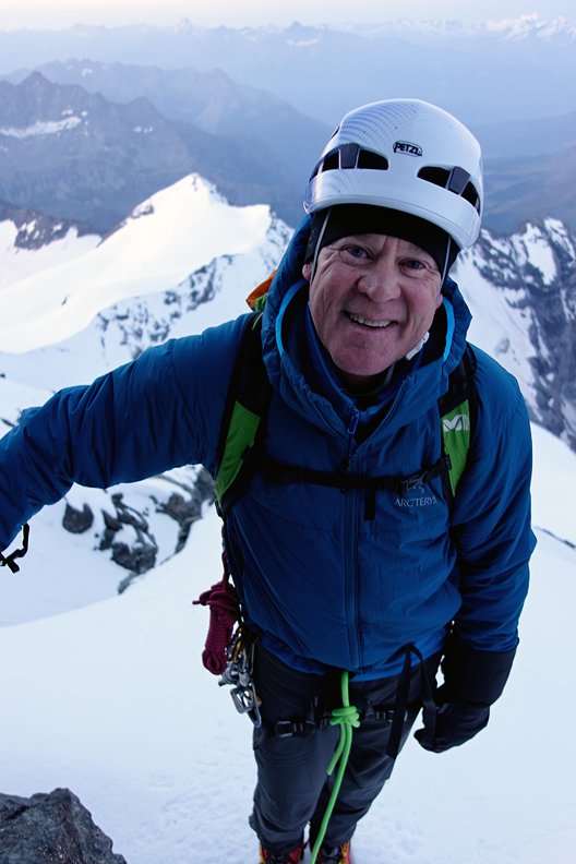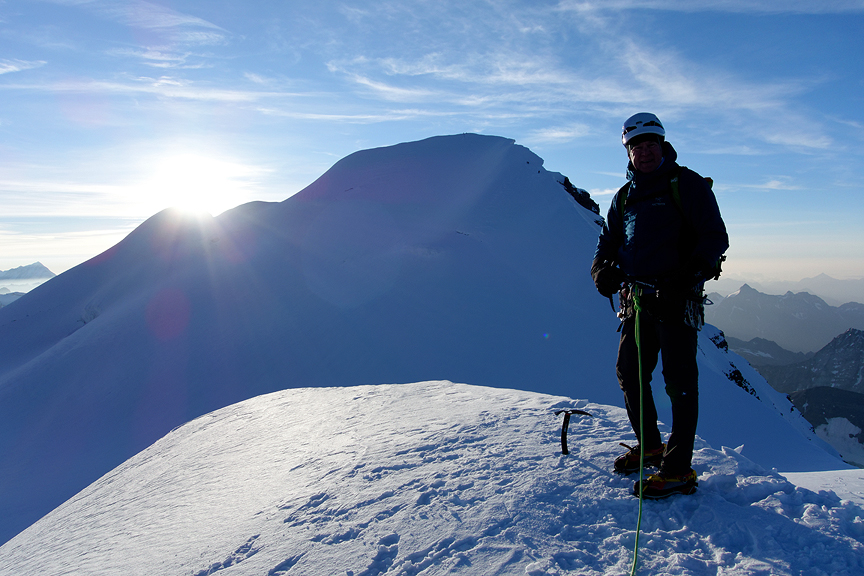 Grant on the summit of the Combin de Valsorey. The highest summit of the Grand Combin, the Combin de Grafeneire, behind. |